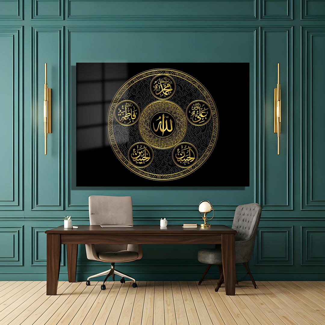 ALLAH CC MUHAMMET SAV HZ. FATIMA HZ. ALI HZ. HASAN HZ. HUZEIN WRITING ON GLASS PAINTING