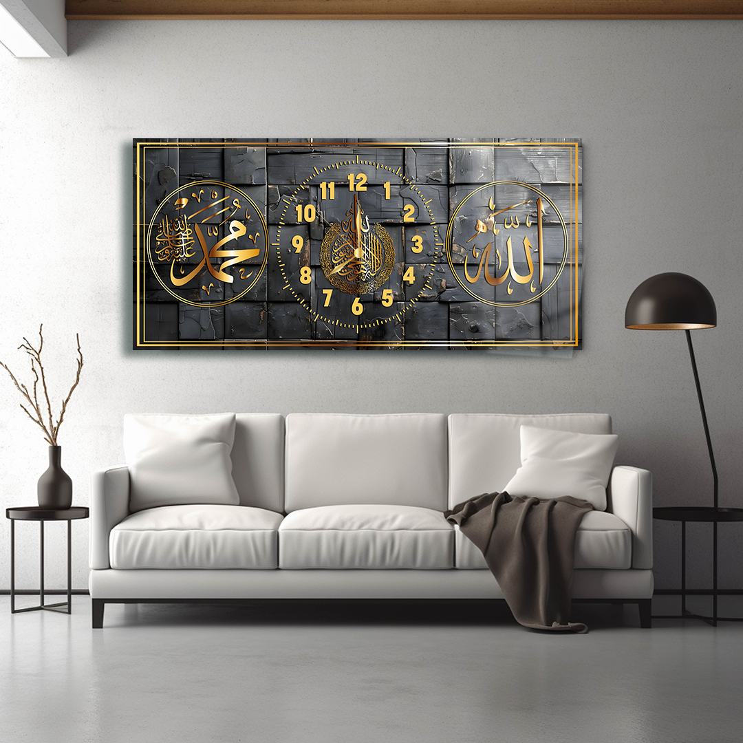ALLAH (C.C) MUHAMMET (S.A.V) AYETEL KÜRSİ YAZILI SAATLİ CAM TABLO (Kopya) (Kopya) (Kopya)