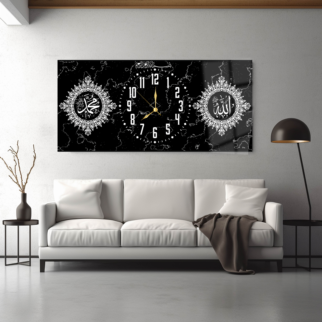 ALLAH (C.C) MUHAMMET (S.A.V) YAZILI SAATLİ CAM TABLO