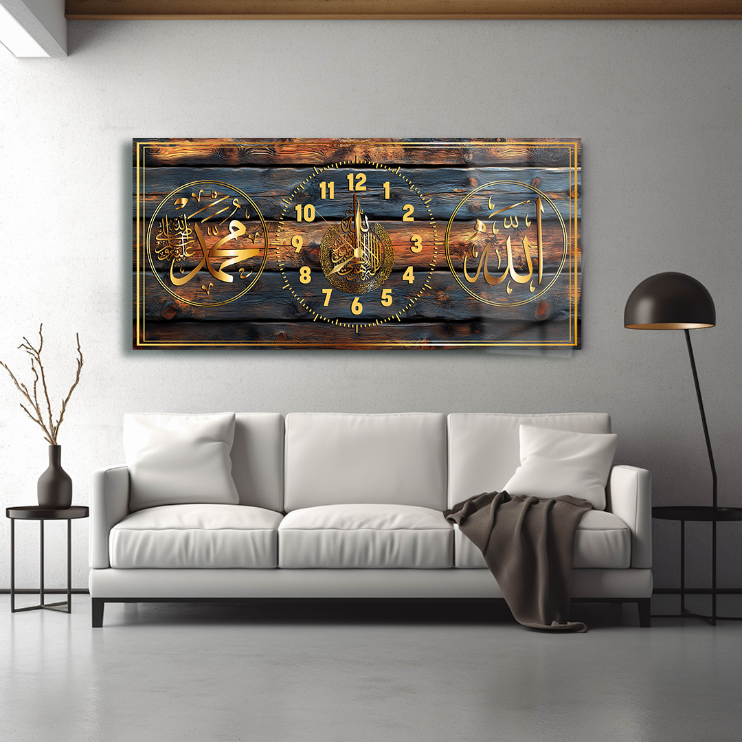 ALLAH (C.C) MUHAMMET (S.A.V) AYETEL KÜRSİ YAZILI SAATLİ CAM TABLO